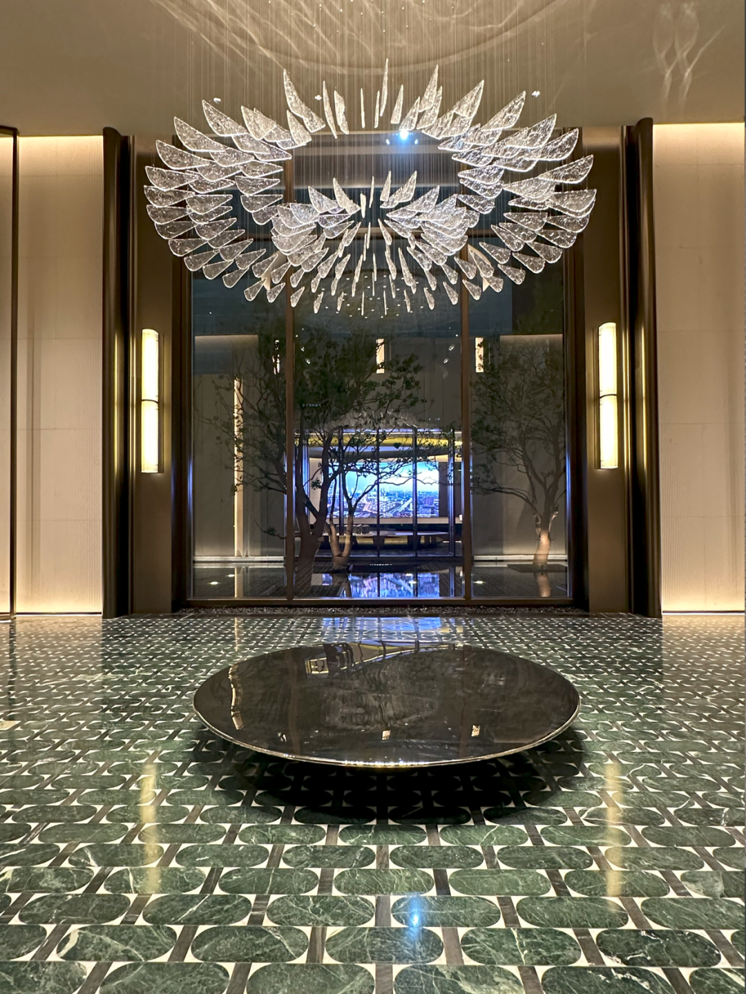 会所大堂的正中央是保利宁波品牌为神气尽头定制的浩瀚灯饰安装